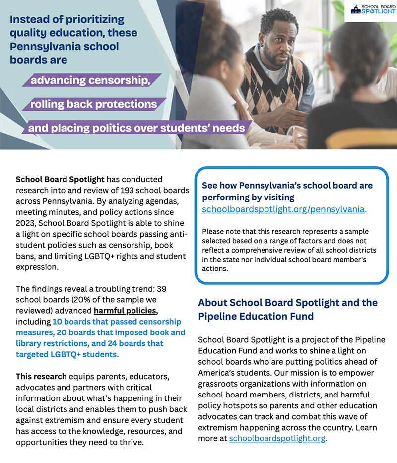 We all want to make sure our children learn the knowledge and skills they need to succeed in the classroom, college, and beyond. But instead of ensuring students get a high-quality education, school boards in Pennsylvania are passing harmful policies that include book bans, censorship and anti-LGBTQ policies. School Boards were formed to protect the interest of students, not to push an unpopular and radical political agenda. Our students deserve better.